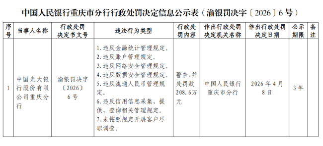 光大银行重庆分行遭央行警告 因7项违规被罚208.6万光大银行重庆分行遭央行警告2026-04-16 11:16:13